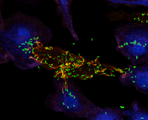 Listeria monocytogenes (green) is a bacterial pathogen that can grow within cells of their host, including macrophages (blue). They also have the remarkable ability to polymerize host cell actin (red) to propel them into neighbouring cells, allowing them to spread within our tissues. (Brumell Lab)