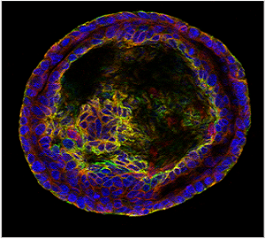 Mouse mammary epithelial derived "mammosphere" where multiple oncogenic events have been combined to study emergence of the cancer phenotype ex vivo. This mammosphere is stained with antibodies against luminal (cytokeratin 8) and basal (cytokeratin 14) epithelial cell markers. Nuclei are DAPI stained. (Egan Lab)