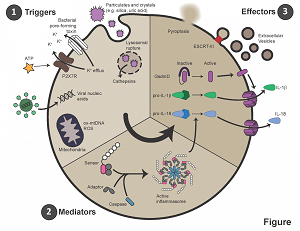 Canonical inflammasome pathways are activated by endogenous or exogenous cellular stress. Following inflammasome assembly, a variety of mediators are released to propagate the innate immune response. (Goldenberg Lab)