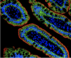 Dual IF labeling of iALP and beta-catenin antibodies on paraffin section of normal human duotenum. (Muise Lab)