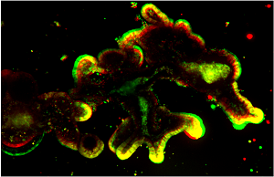 Swelling of tissue organoid from a mouse ileum before (red) and after (green) activation of Cystic Fibrosis Transmembrane Regulator (CFTR), whose gene is mutated in Cystic Fibrosis. A cross-section of ileal organoid obtained by high content 3D microscope (IXMC) is shown. (Rotin Lab)
