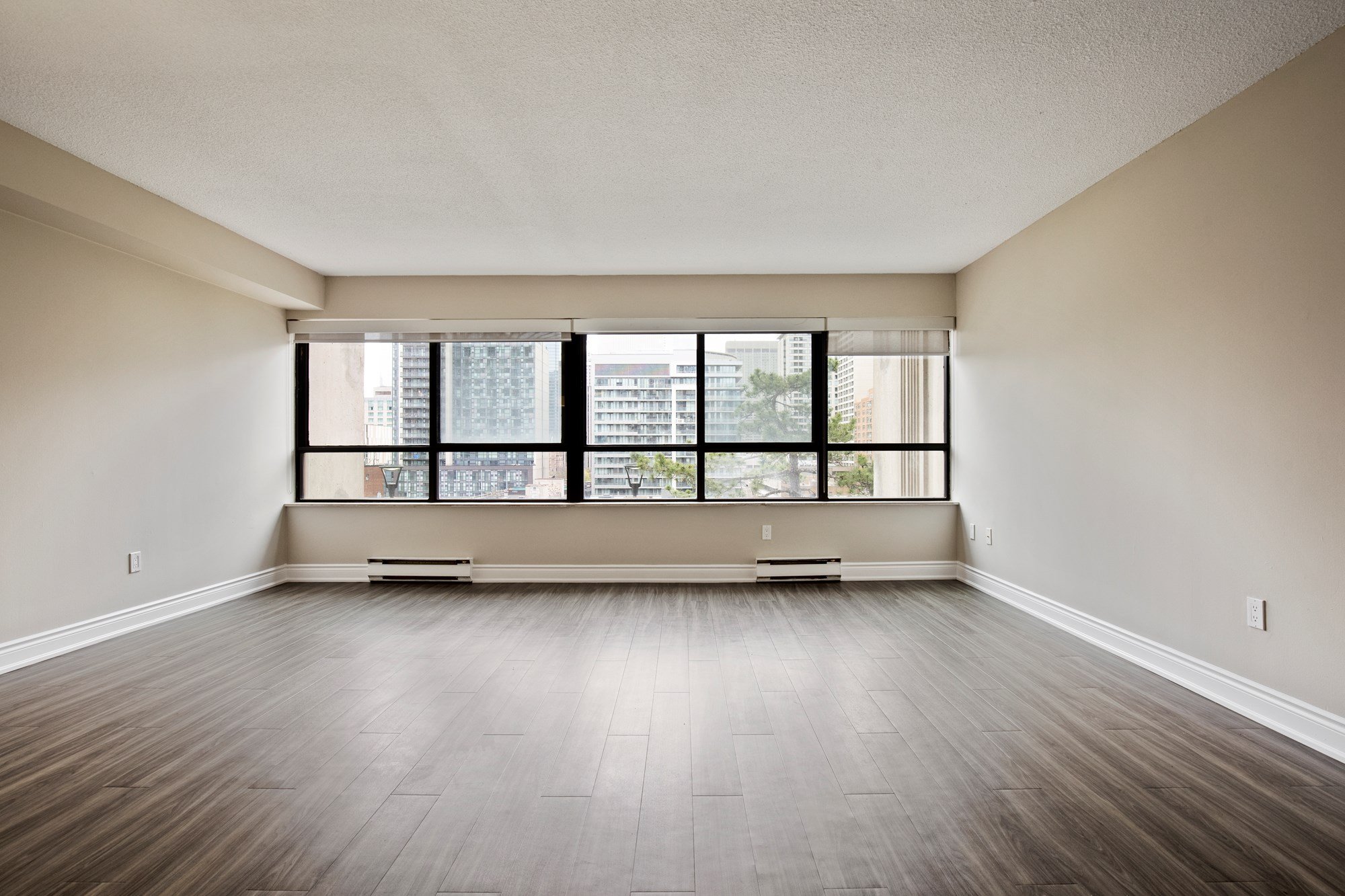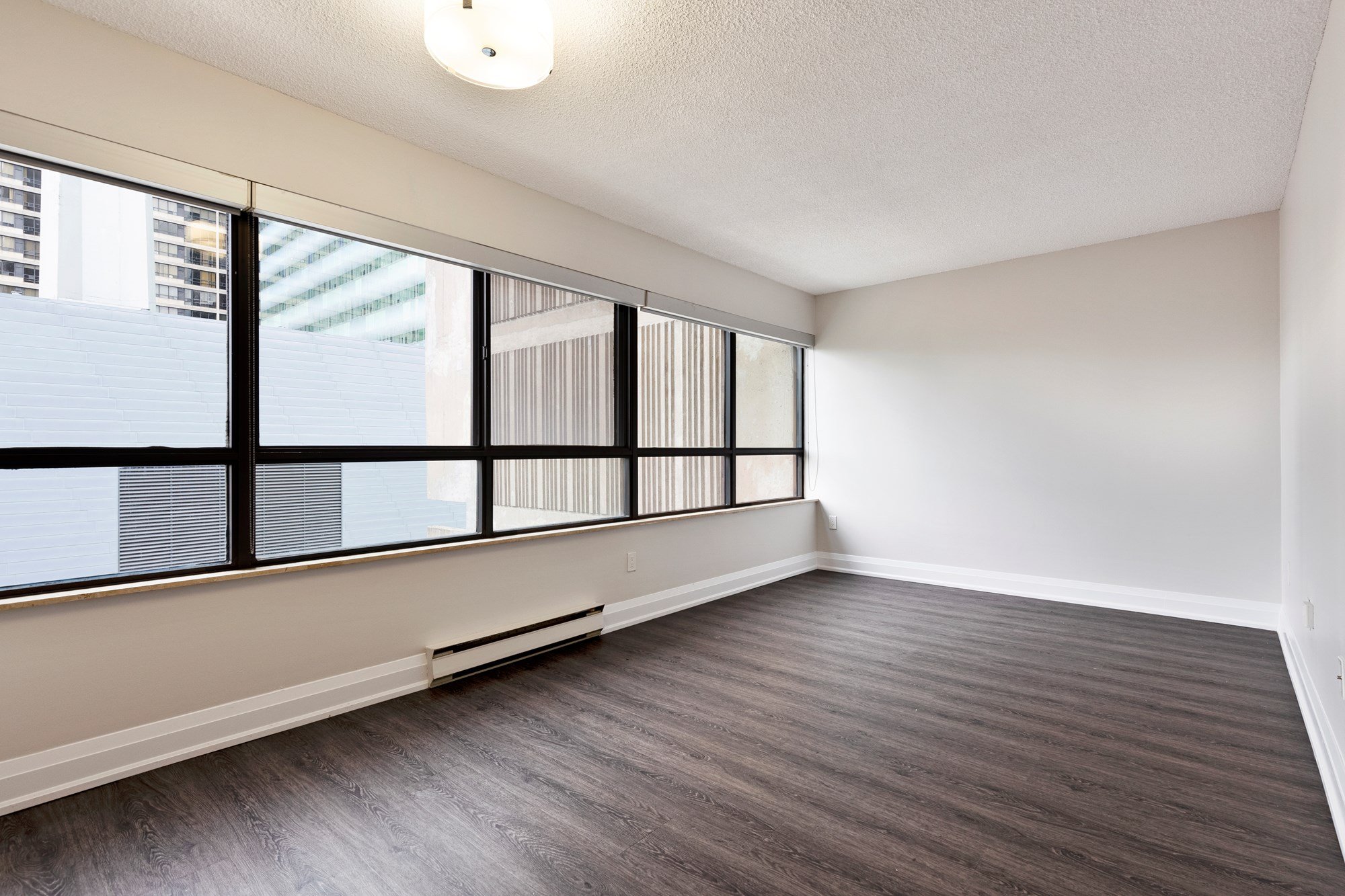 - Wall-to-wall windows with roller window shades