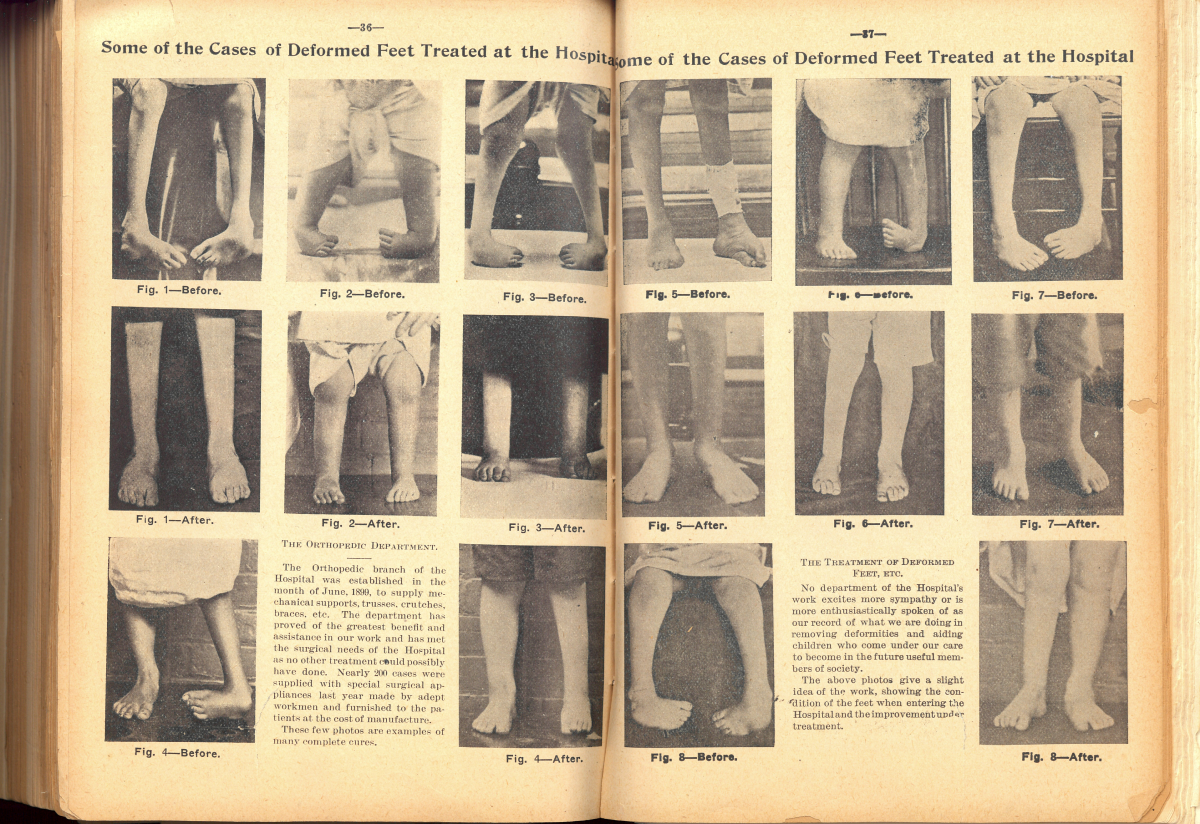 This two-page spread from the 1899-1900 SickKids Annual Report details cases of "club foot" treated at SickKids, which was one of the most common types of surgeries at the time.