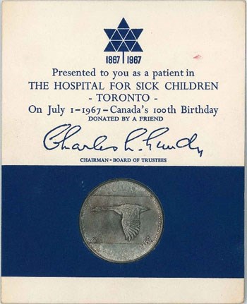 Jennifer Rock woke up at SickKids on July 1, 1967, four days after her corrective urologic surgery, to a special gift from the hospital – a coin commemorating Canada’s centennial. Today, the coin is a fond reminder of her hospital stay. An estimated 336 inpatients received the coin on Canada Day.