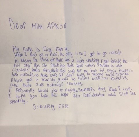 My name is Elise from 7A. When I was on a Pass, the only time I get to go outside to enjoy the fresh air there was a lady smoking right beside me. Not only was she smoking there were others smoking to and cigarette buds everywhere. Not just for me but for every patients time outside, to make sure we don’t have to second hand smoke please get a security guard to patrol hospital property and make sure nobodys smoking. I personally would like to enjoy a summers day when I can. I hope you take this letter into consideration and stop the smoking.