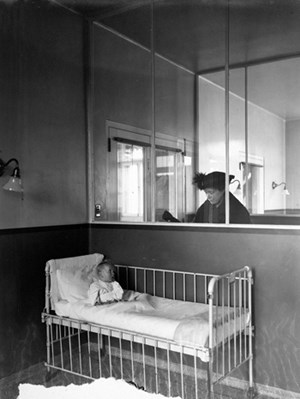 As germ theory took hold in the late 1800s, hospitals became restrictive to the outside world. Whereas previously parents had been encouraged to visit they now found barriers separating them from their children. At the time, keeping ill patients away from family members who had the potential to spread germs and disease was thought to benefit the patients both physically and psychologically.