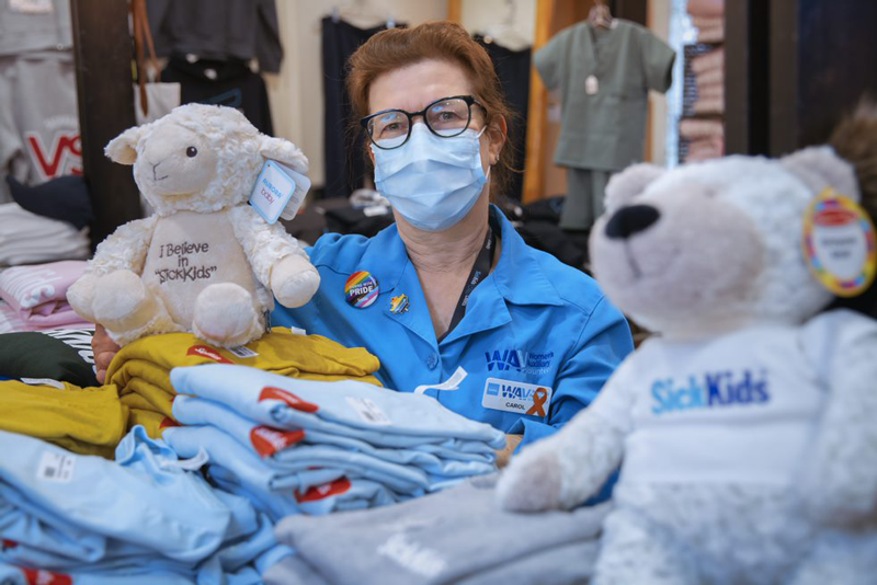 Carol is one of many Women’s Auxiliary Volunteers (WAV) whose presence at SickKids adds “an extra dimension of care to patients and families.” Their many duties include operating the 5Fifty5 gift shop (as Carol is doing above), including stocking the shop and filling online orders. In addition, WAV volunteers work in the Family Centre, the Surgical Waiting Room, and run the WAV Bravery Bead Program. Some volunteer sewers are also creating items for sale in the shop.