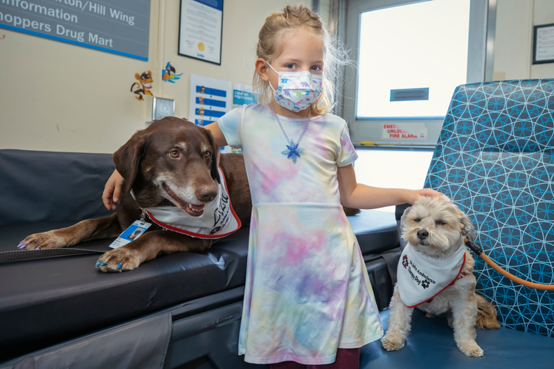 Therapy dogs, like Liza and Benji, and their handlers, can sometimes be found at the COVID Testing Centre. Being soft and cuddly, these pooches help put patients like Olivia at ease when receiving a COVID-19 vaccination.