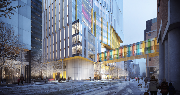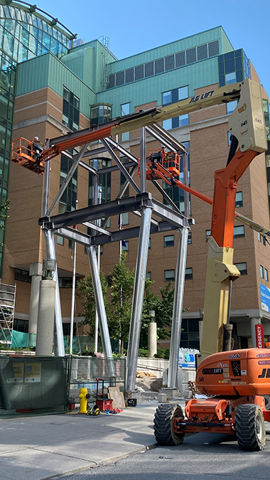 In addition to reaching the highest point of construction on the PSC, we reached another project milestone by erecting the new pedestrian bridge that will connect SickKids Atrium to the PSC when it opens next year. The original bridge was dismantled in 2019 to prepare for demolition of the Elizabeth McMaster building. Now, a newer and wider bridge connection has taken its place. The new bridge will be open to SickKids staff, patients and families in 2023, when the building opens.